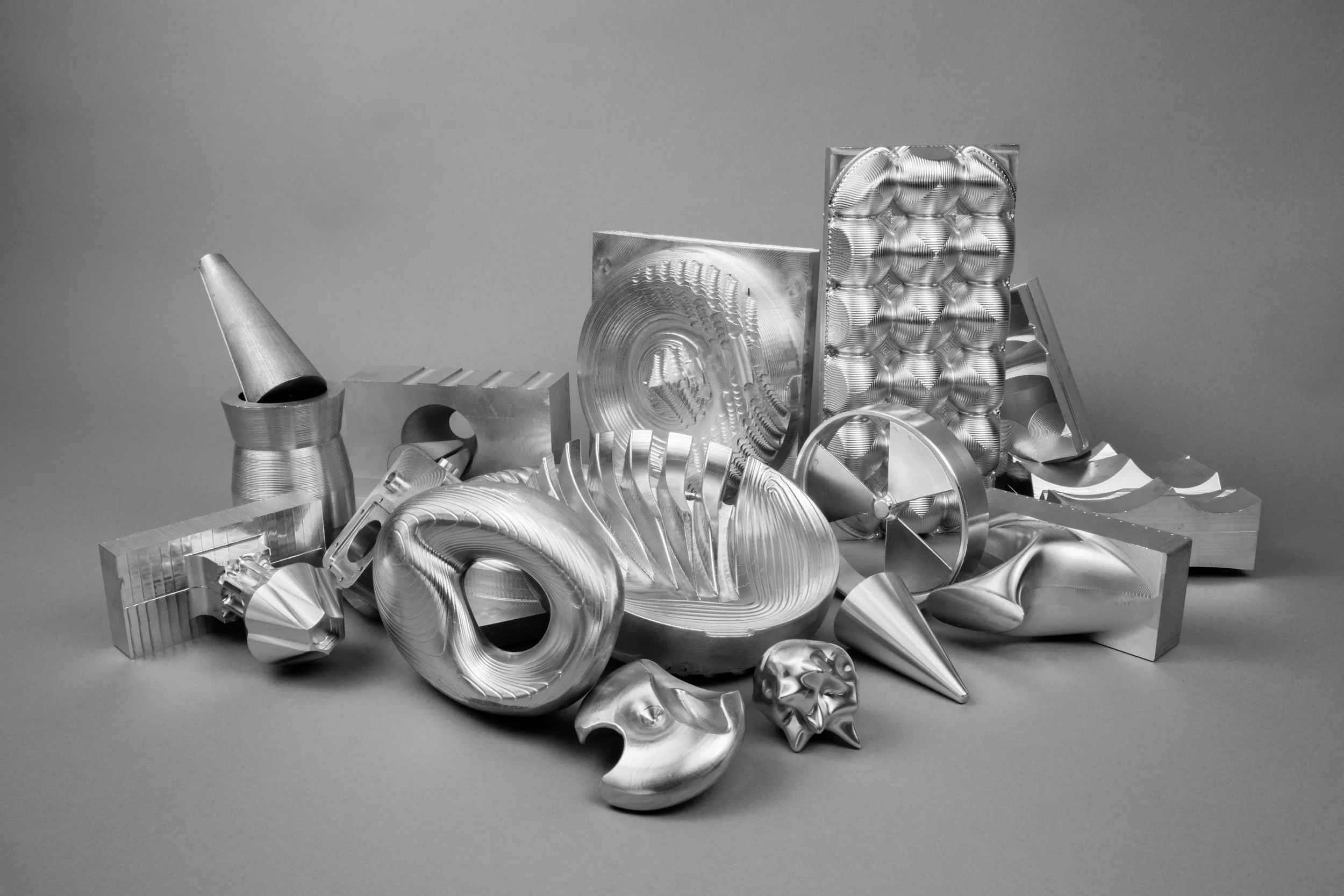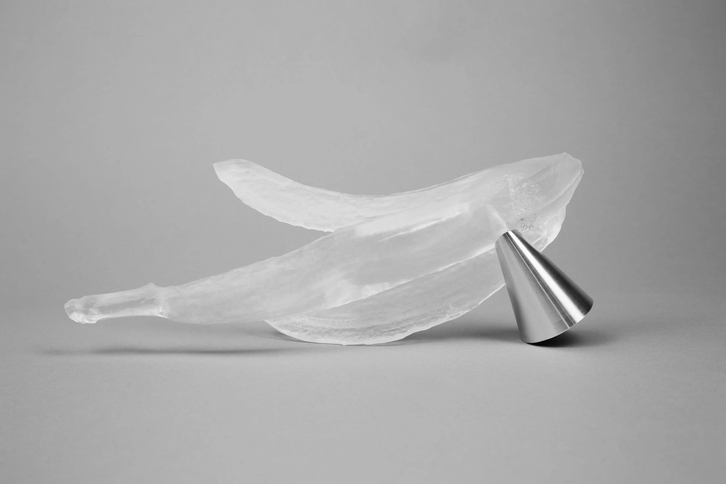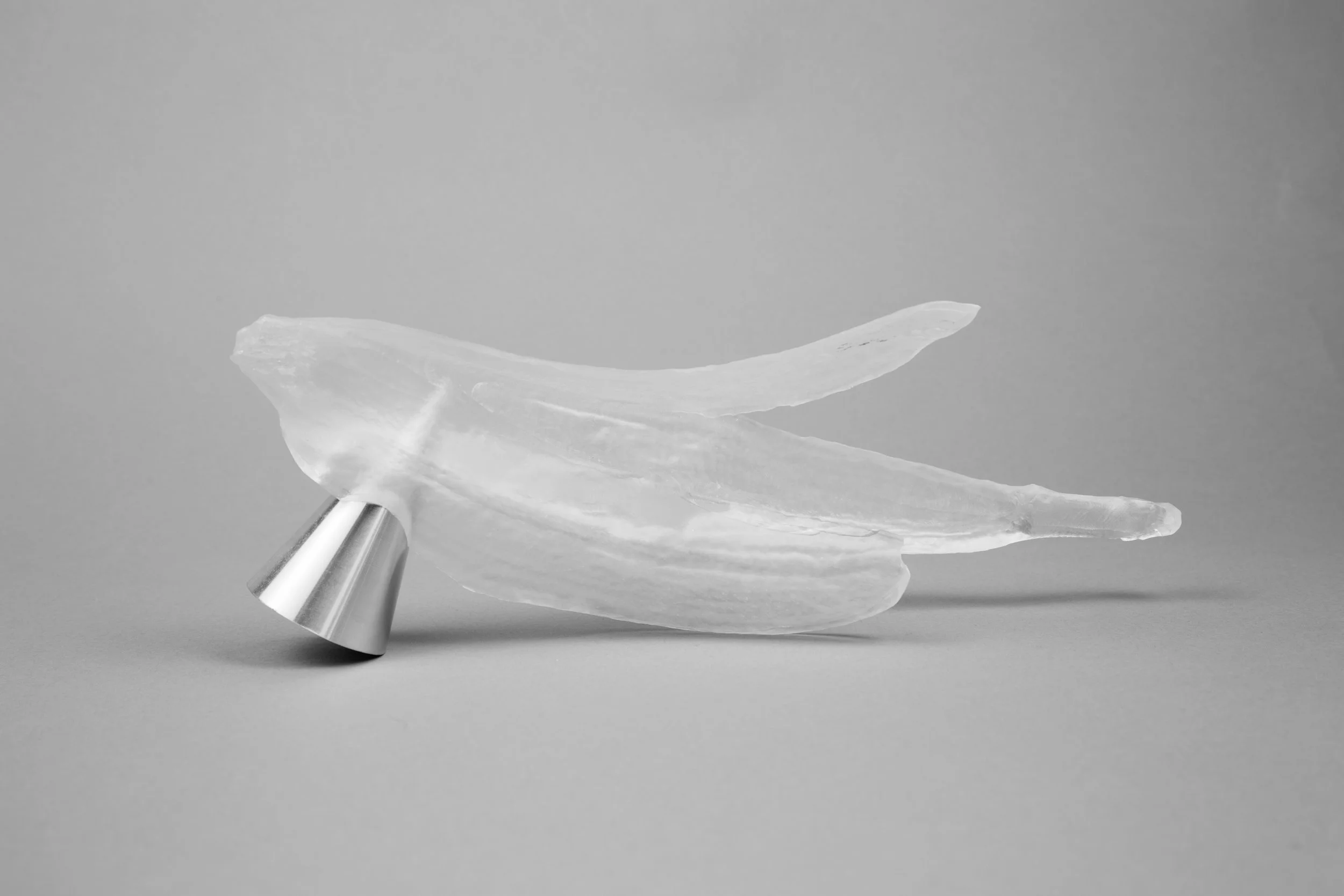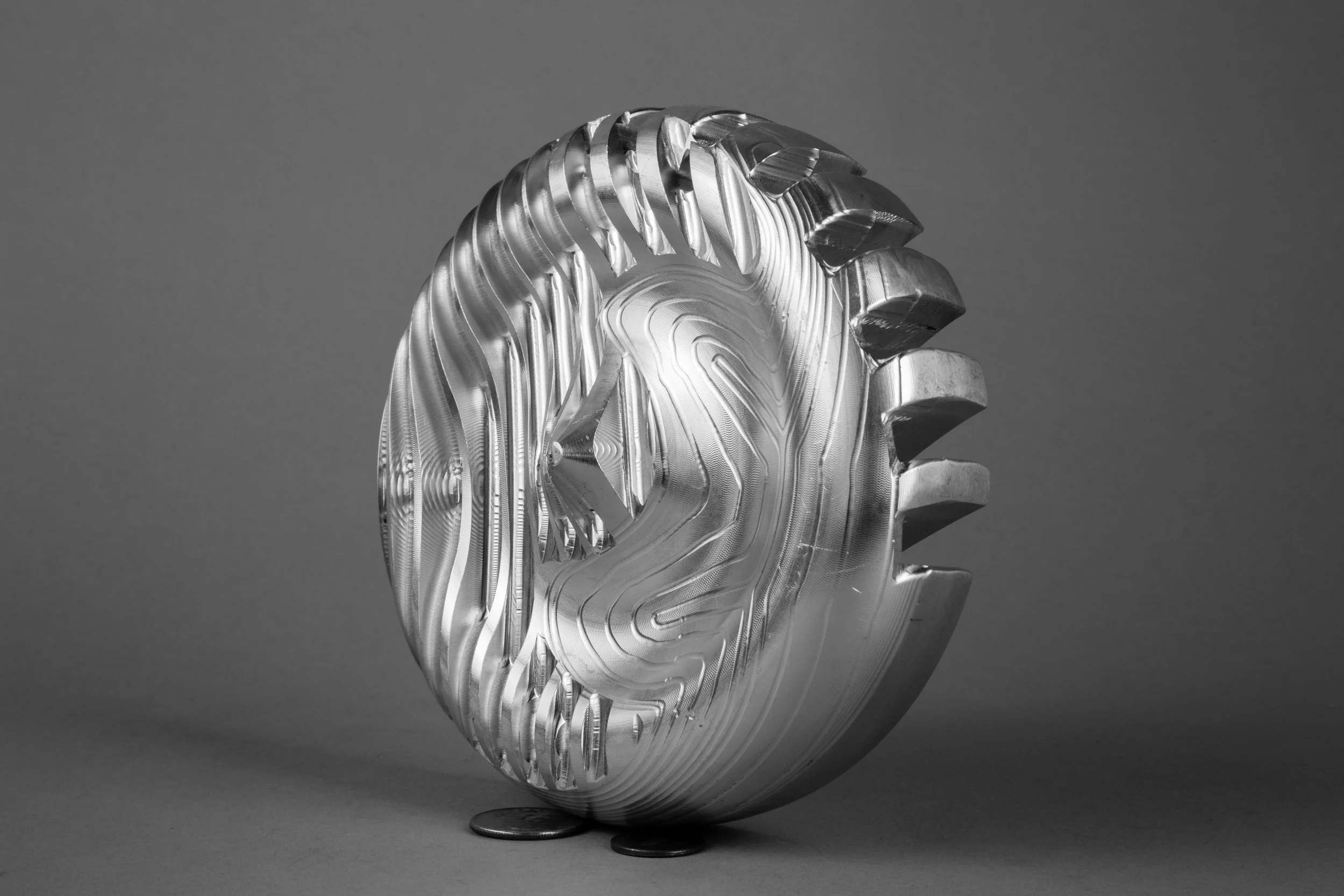 Ranging from playful and organic to geometric and hard-edged, my carving series is an exploration of three-dimensional form. I generated most of these forms by manipulating sketches and extrusions in 3D modeling software, sometimes cutting out large sections in order to reveal an object’s surface and structure simultaneously. On a more whimsical note, however, I decided to make a machined banana series by scanning the fruit or its peel with a laser, and then bringing the model in a 3D software environment for programming and machining. All of these pieces were machined out of solid aluminum or plastic on a Computer Numerical Control (CNC) machine. This abrupt, unexpected appropriation of a technology usually reserved for manufacturing and aerospace speaks to something very modern: by taking away its utility, the machining process becomes a collaboration between artist and machine, expanding the options for making meaning through code.