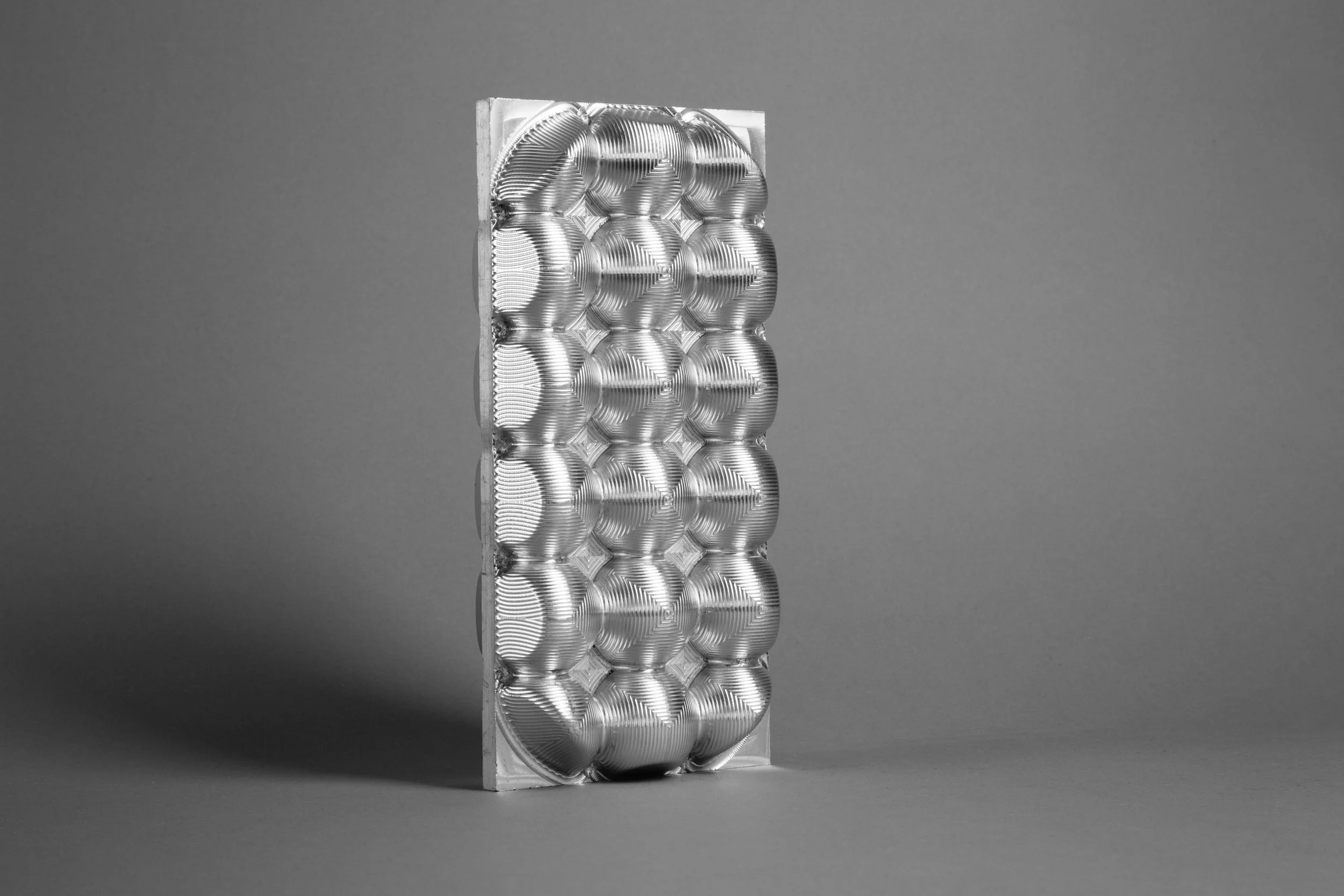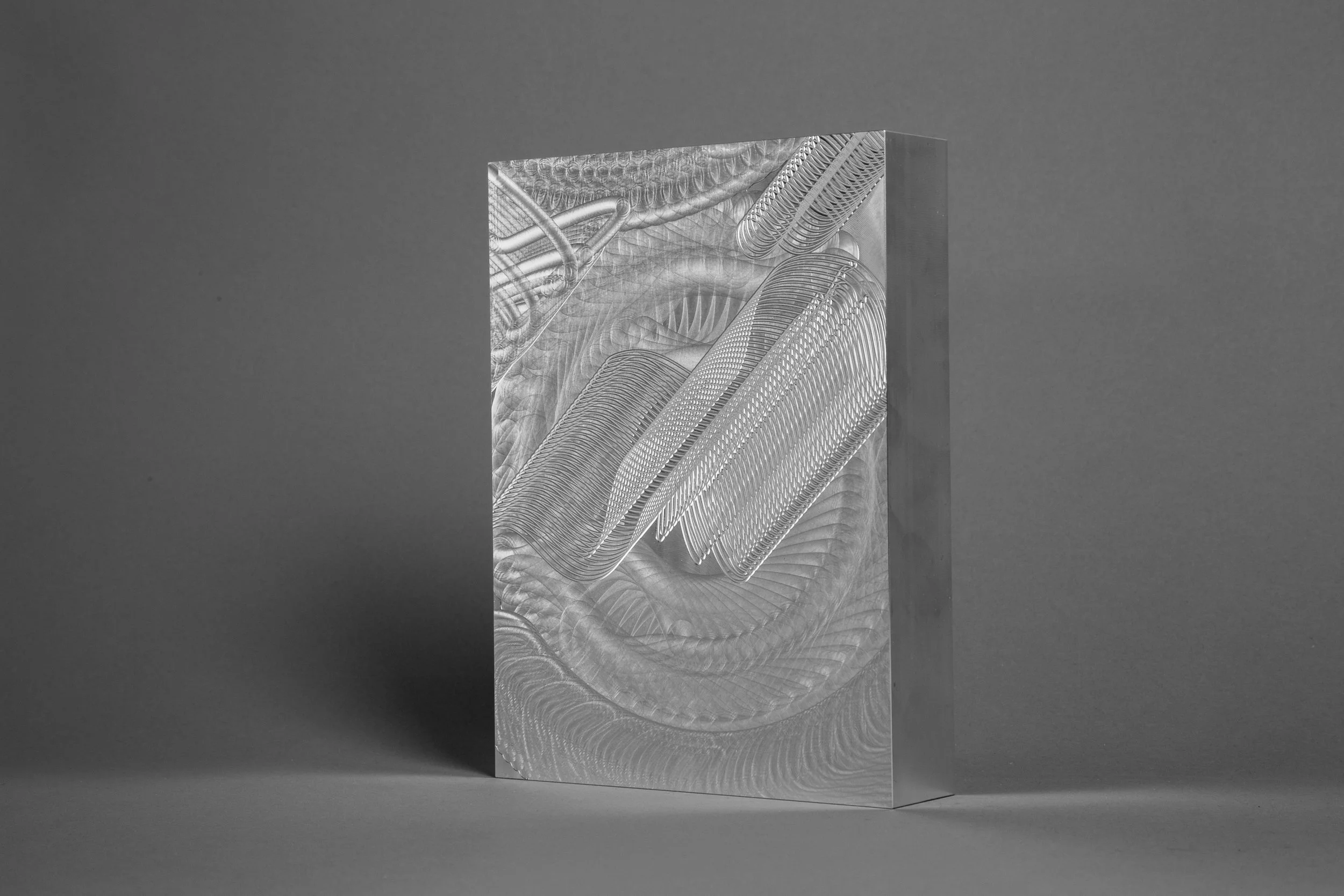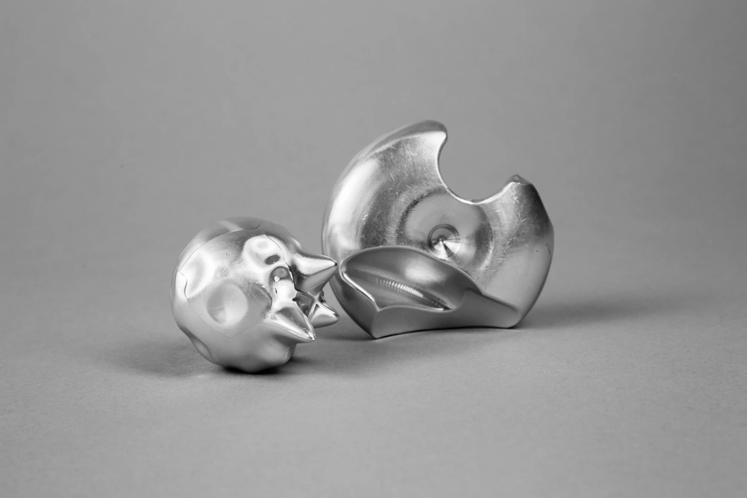 Ranging from playful and organic to geometric and hard-edged, my carving series is an exploration of three-dimensional form. I generated most of these forms by manipulating sketches and extrusions in 3D modeling software, sometimes cutting out large sections in order to reveal an object’s surface and structure simultaneously. On a more whimsical note, however, I decided to make a machined banana series by scanning the fruit or its peel with a laser, and then bringing the model in a 3D software environment for programming and machining. All of these pieces were machined out of solid aluminum or plastic on a Computer Numerical Control (CNC) machine. This abrupt, unexpected appropriation of a technology usually reserved for manufacturing and aerospace speaks to something very modern: by taking away its utility, the machining process becomes a collaboration between artist and machine, expanding the options for making meaning through code.